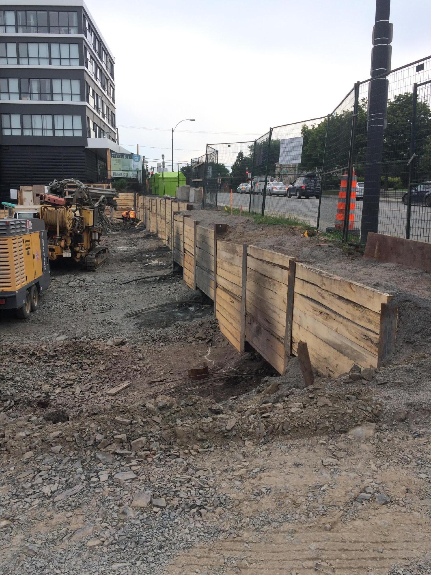 The project consisted of building a temporary soldier pile wall around the entire perimeter of the lot at an average depth of 5 metres to support the expansion of a building with two levels of underground parking.