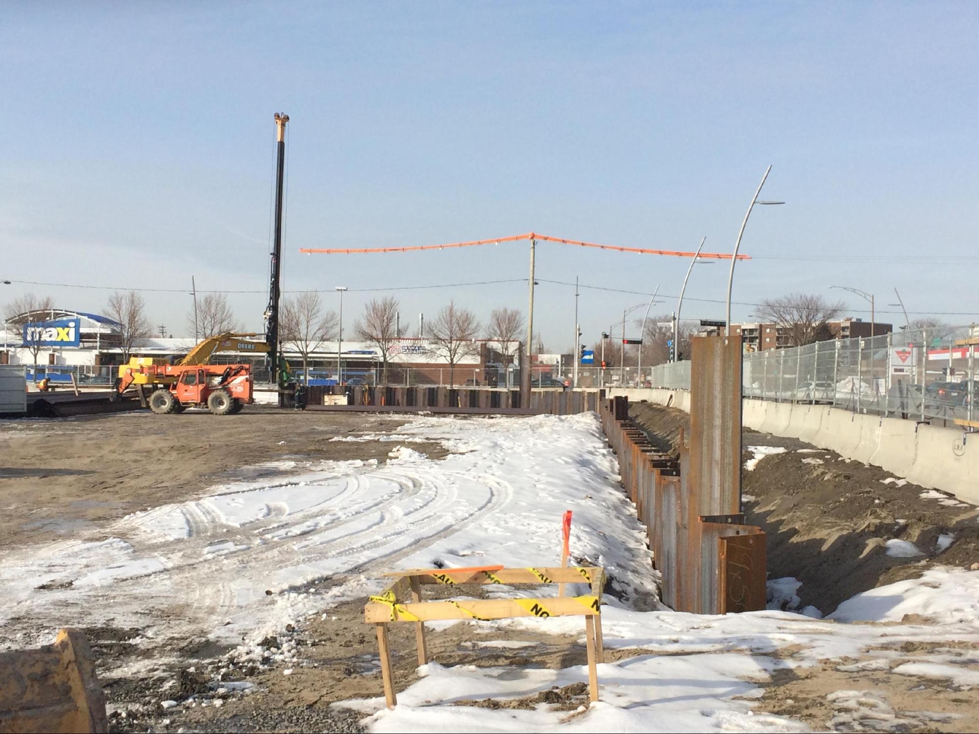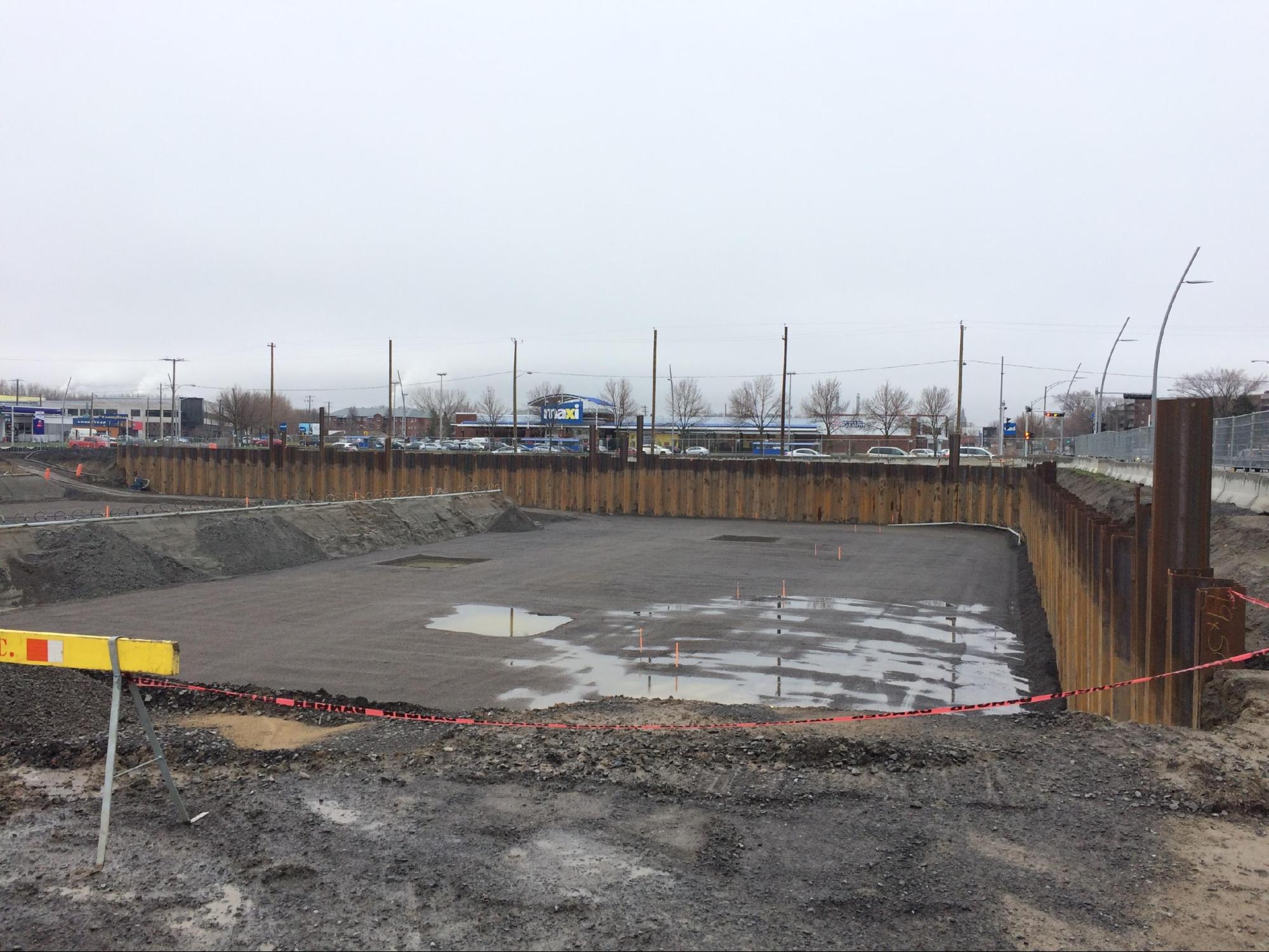 - Le projet consistait à réaliser un mur de soutènement temporaire de 157 mètres linéaires en palplanche d’acier étanche de 50 pieds pour permettre l’excavation d’un nouveau bâtiment et permettre le bétonnage à sec.