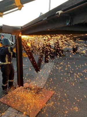 Construction d’un bâtiment pour des unités hydrauliques. Démolition et construction d’une structure d’acier et mise en place de cylindres hydrauliques.