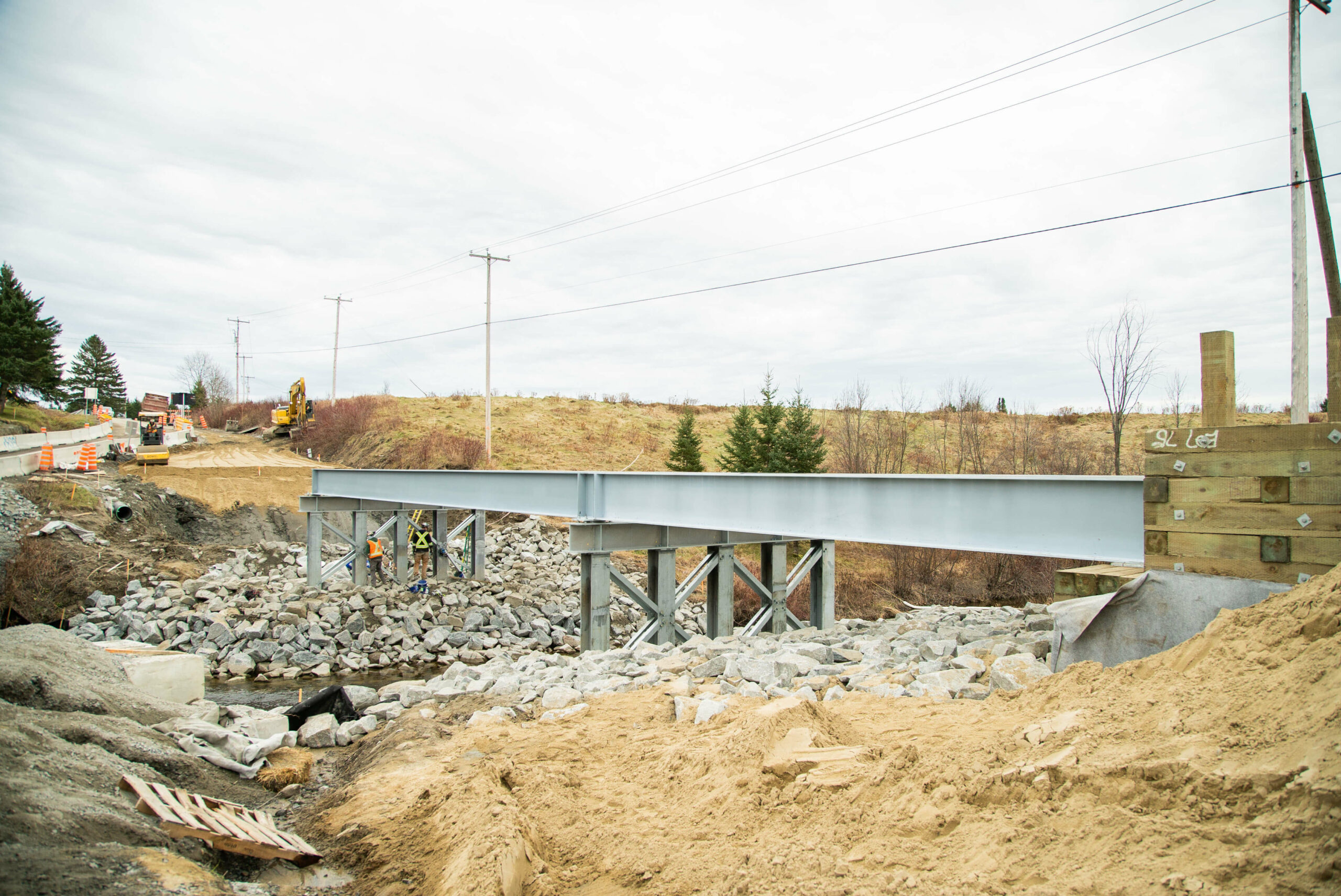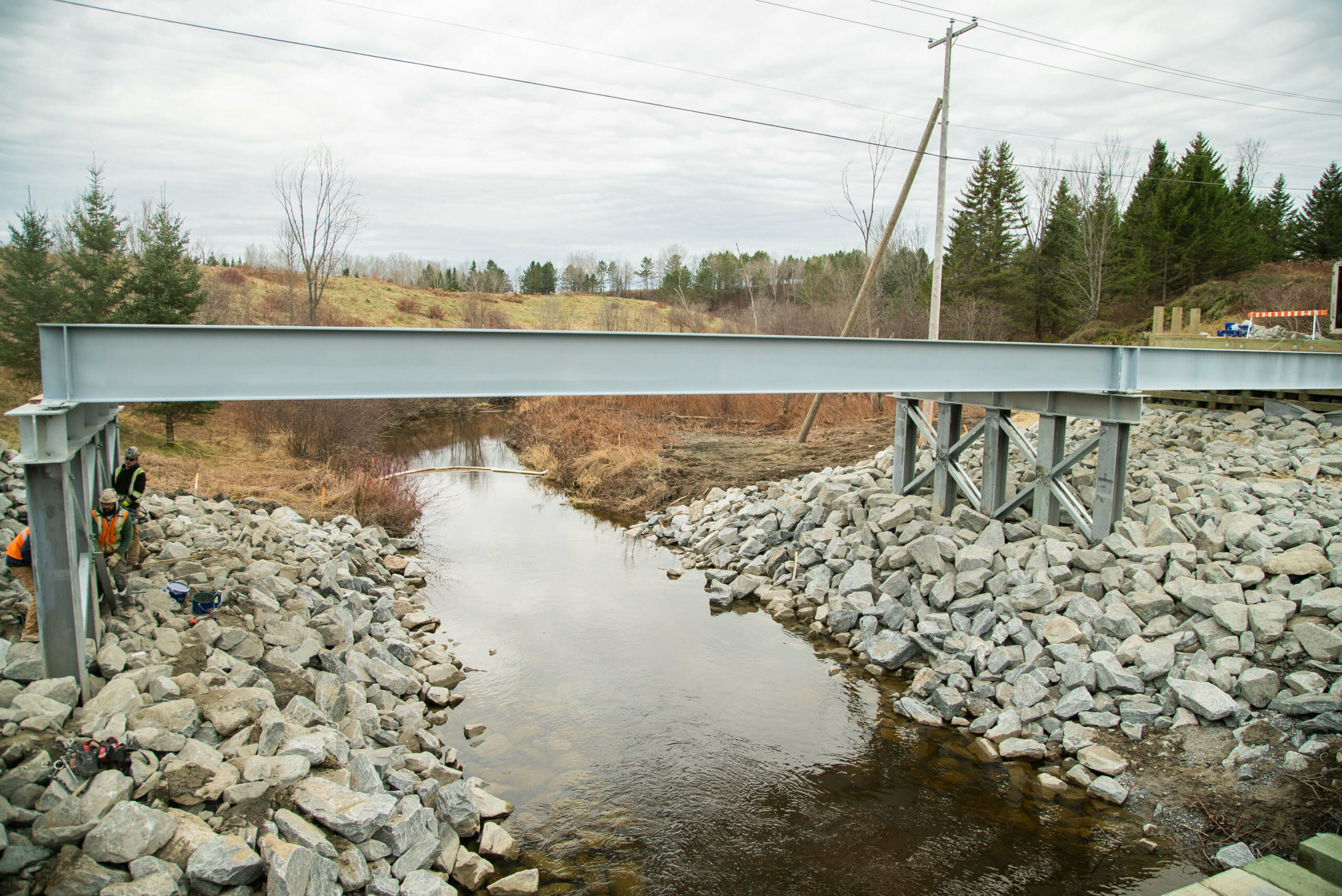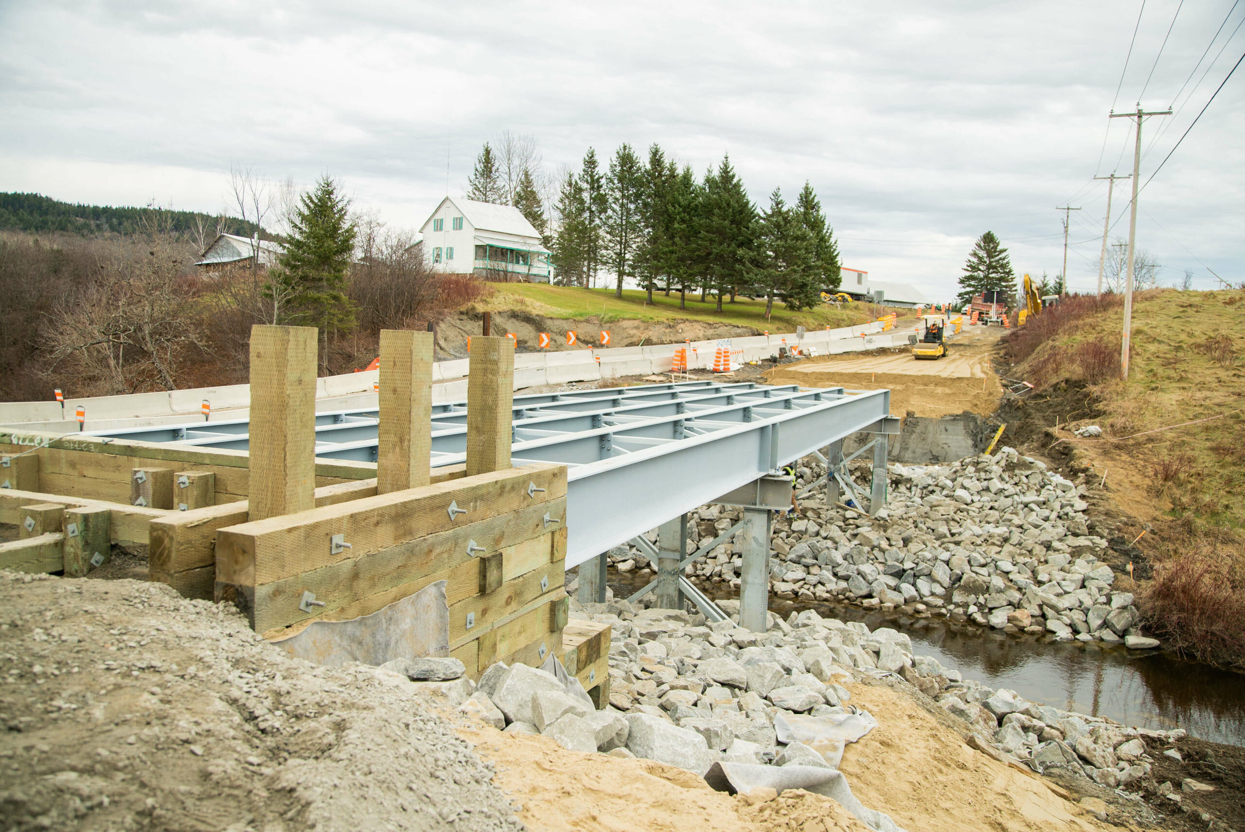 - Installation de l’enrochement, asphaltage, garde-corps et réfection de la route à l’entrée et à la sortie du pont.