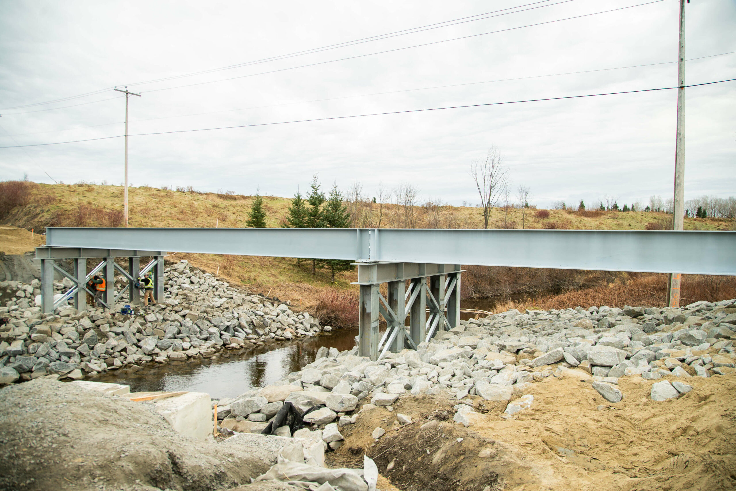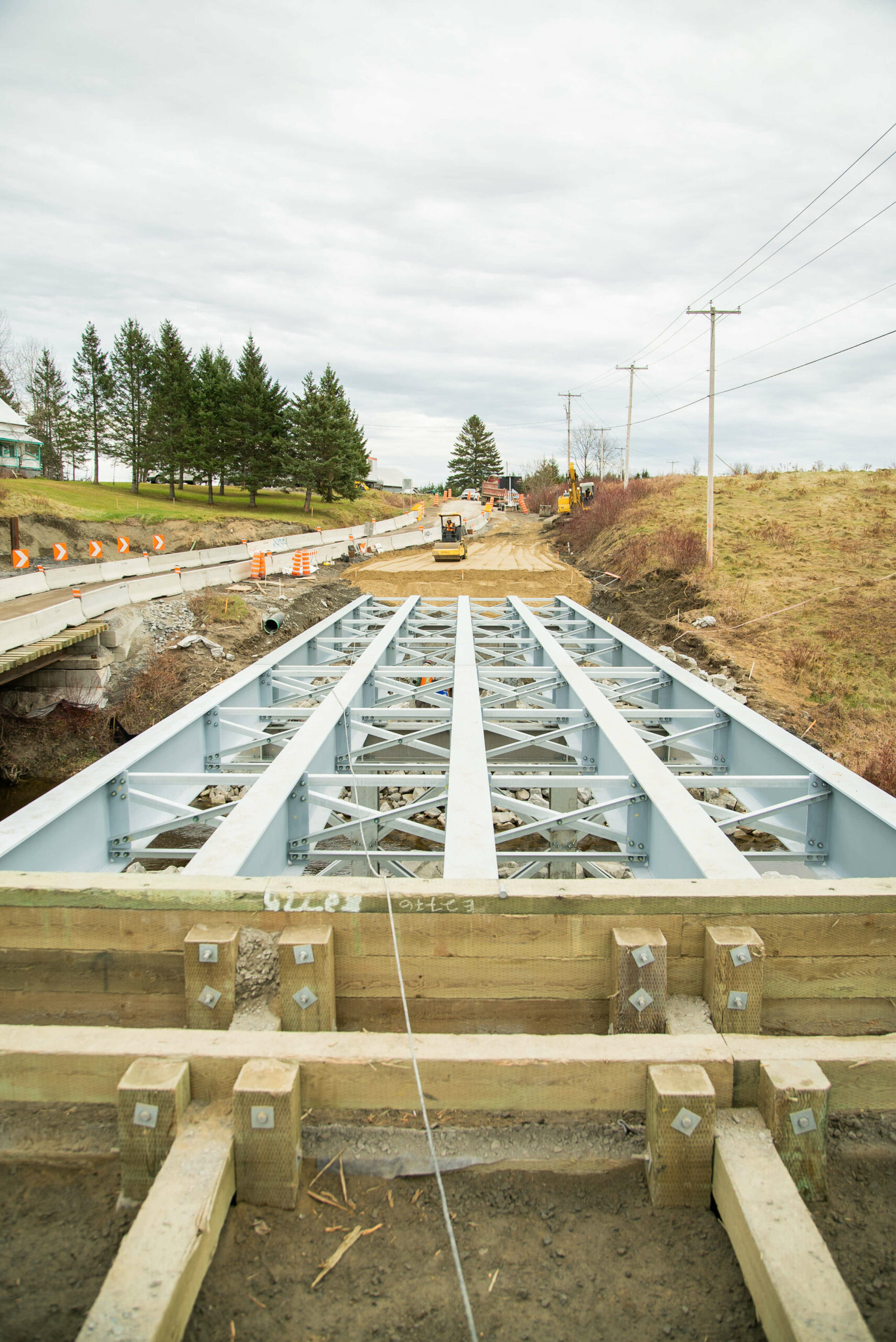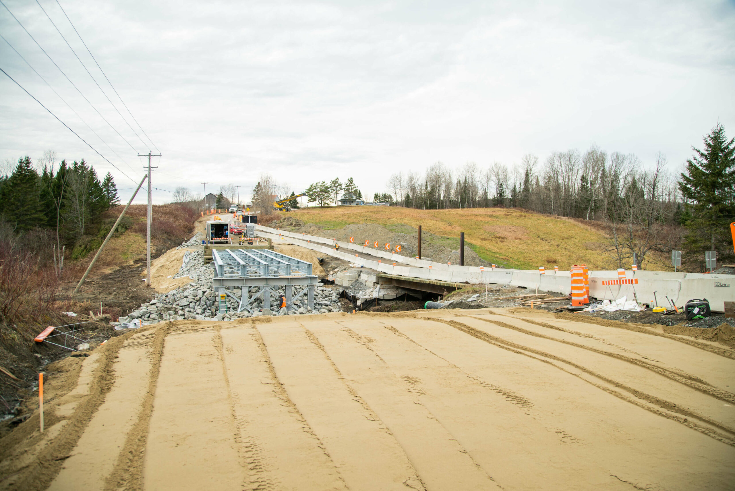 - Installation de l’enrochement, asphaltage, garde-corps et réfection de la route à l’entrée et à la sortie du pont.