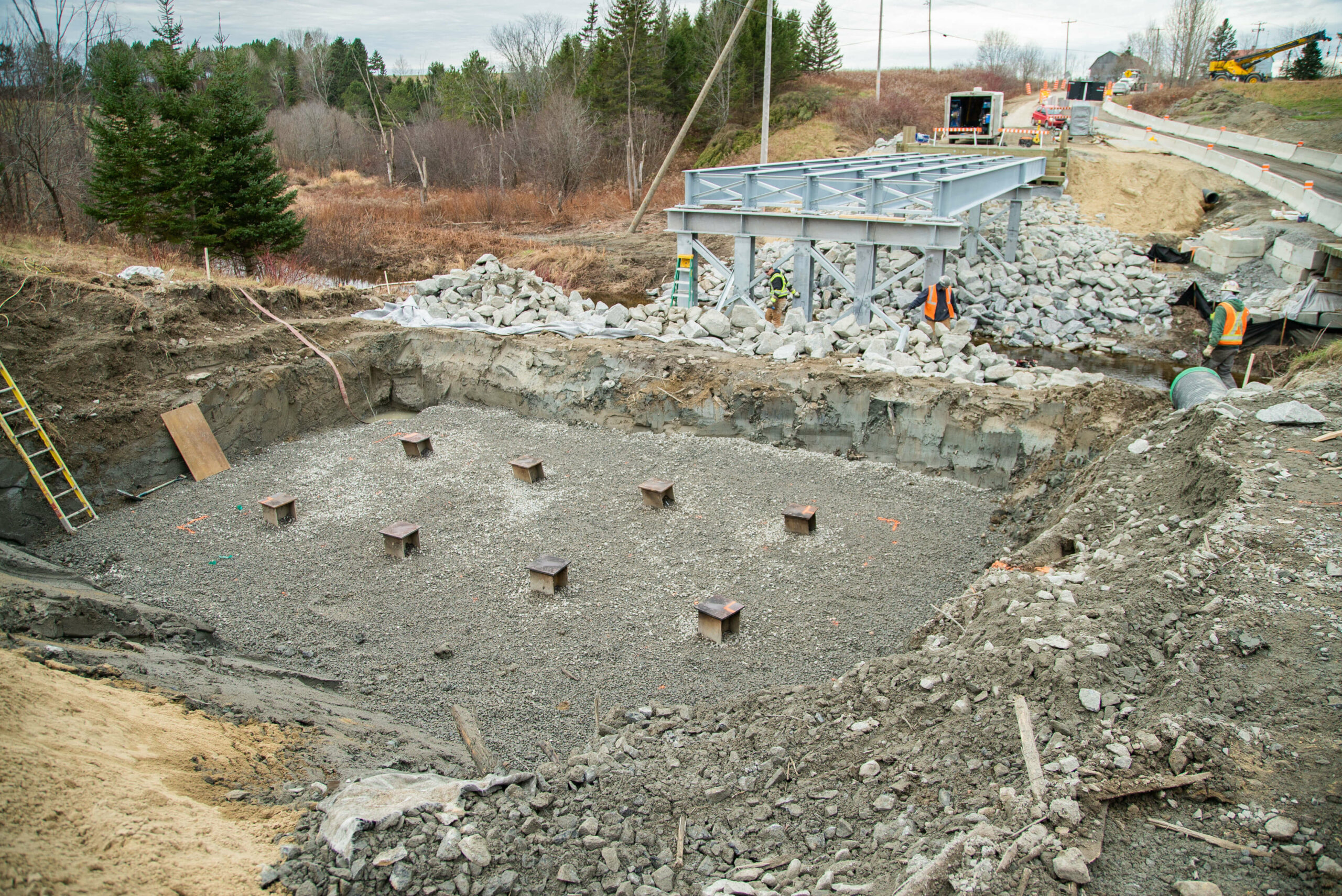 - Excavation, coffrage, et bétonnage de la structure (semelles, béquille, dalles, portique, etc.);