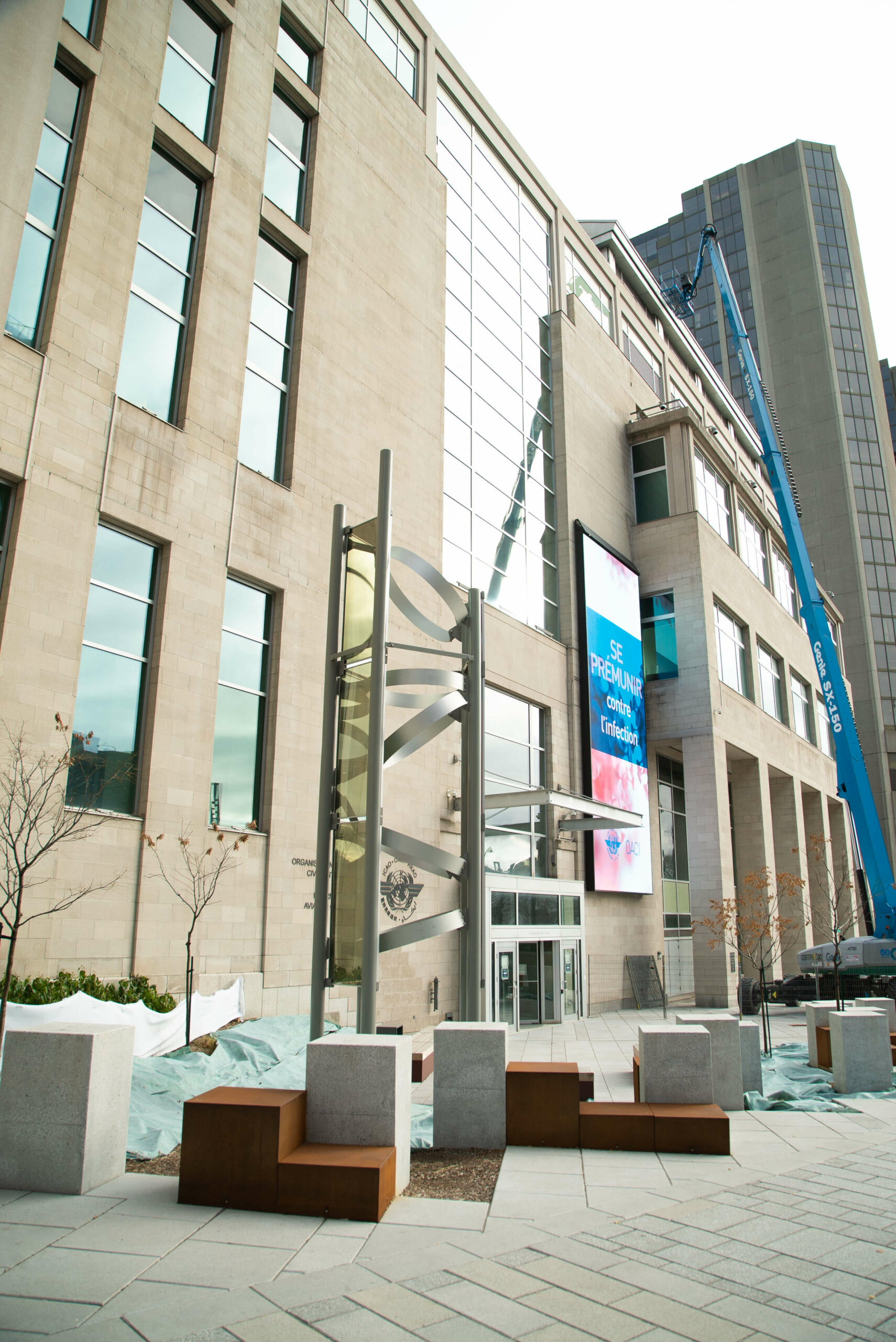 Travaux pour la construction en béton armé d’un système de défense anti-bélier, l’éclairage des façades et l’installation d’un panneau numérique haute dimension et haute définition. Les principaux enjeux pour la réalisation du projet étaient l’espace des travaux très restreint et la gestion logistique, l’échéancier court, la présence de plusieurs cadres de métiers, la coordination entre plusieurs partenaires et la gestion d’équipements et de matériaux au centre-ville de Montréal.