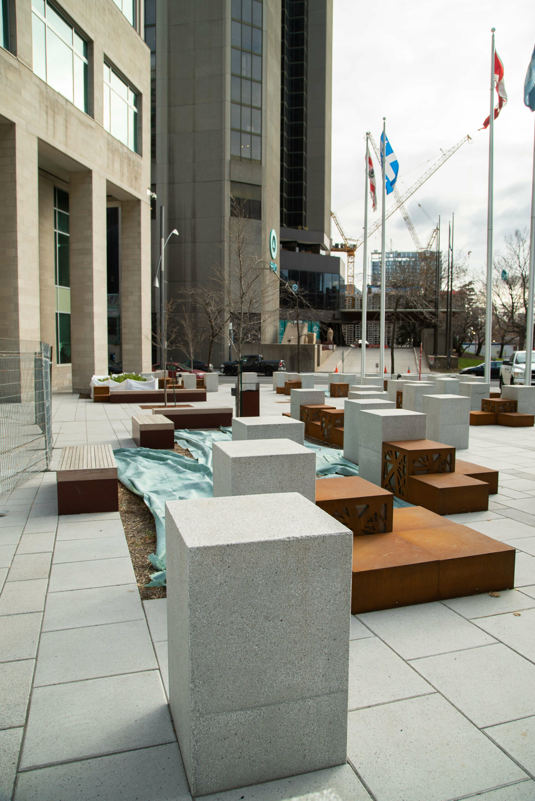 - Aménagement complet de l’extérieur incluant le pavé préfabriqué, le caniveau, la plantation et les éléments de mobiliers urbains;