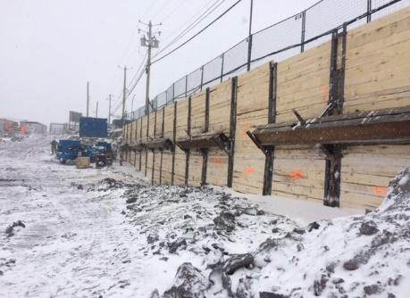 Travaux pour la mise en place d’un mur berlinois sous une ligne HQ pour protéger un terrain voisin.