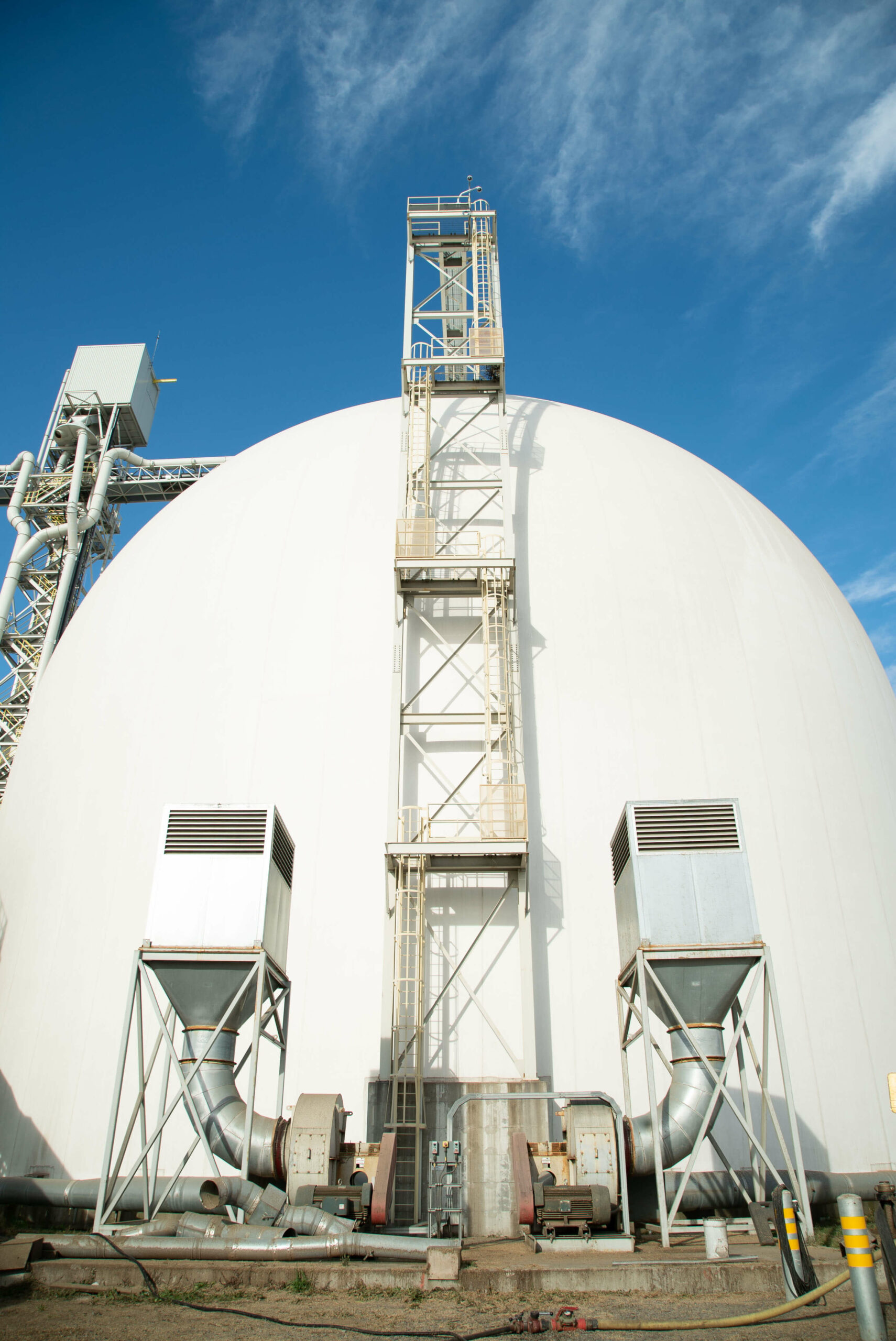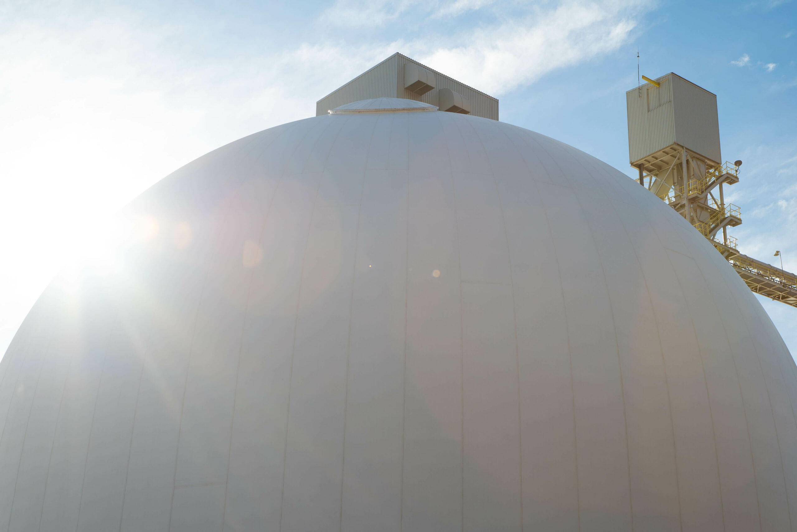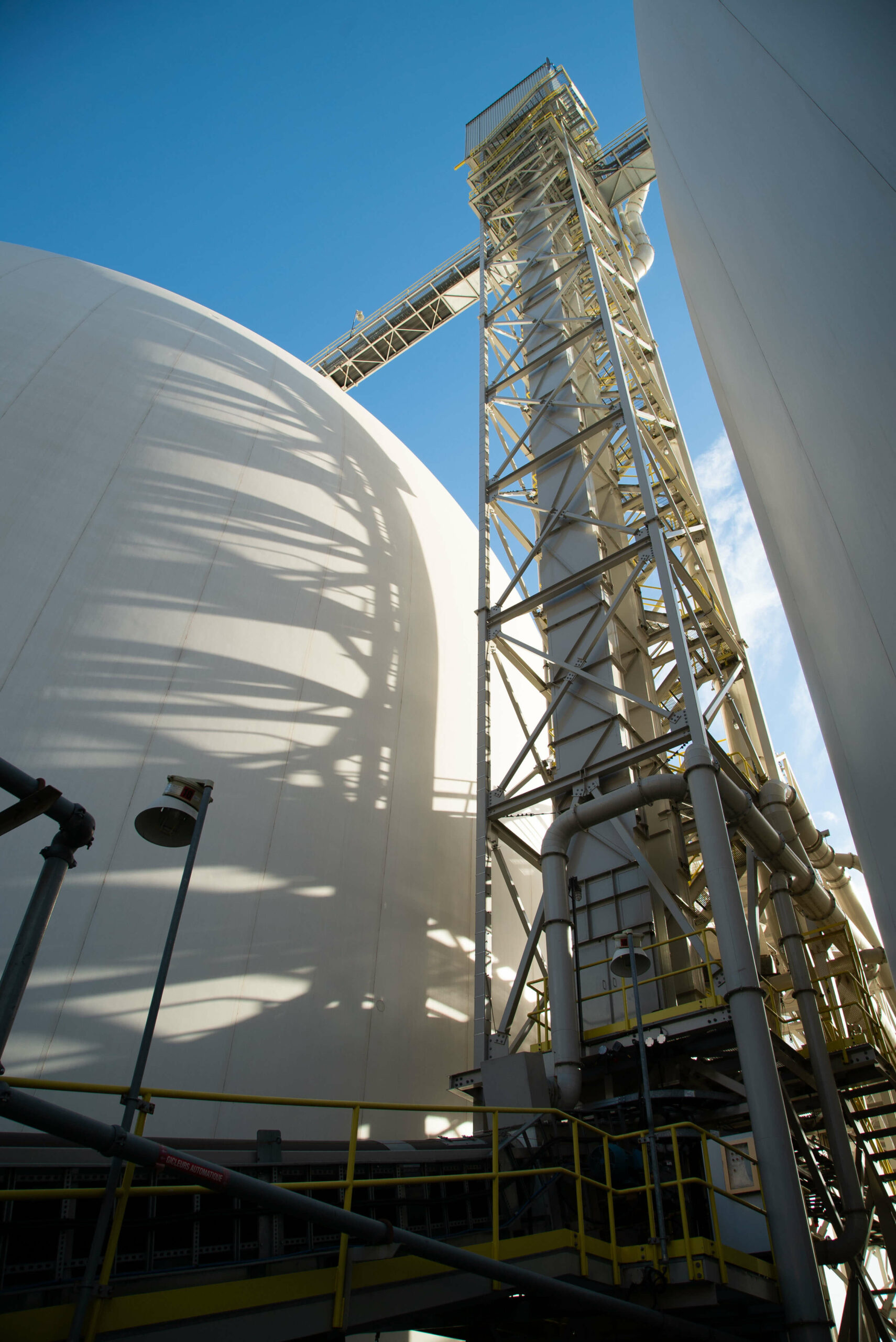 - Deux (2) silos en béton projeté de 48 mètres de diamètre, d’une capacité de 37 500 tonnes chacun ;