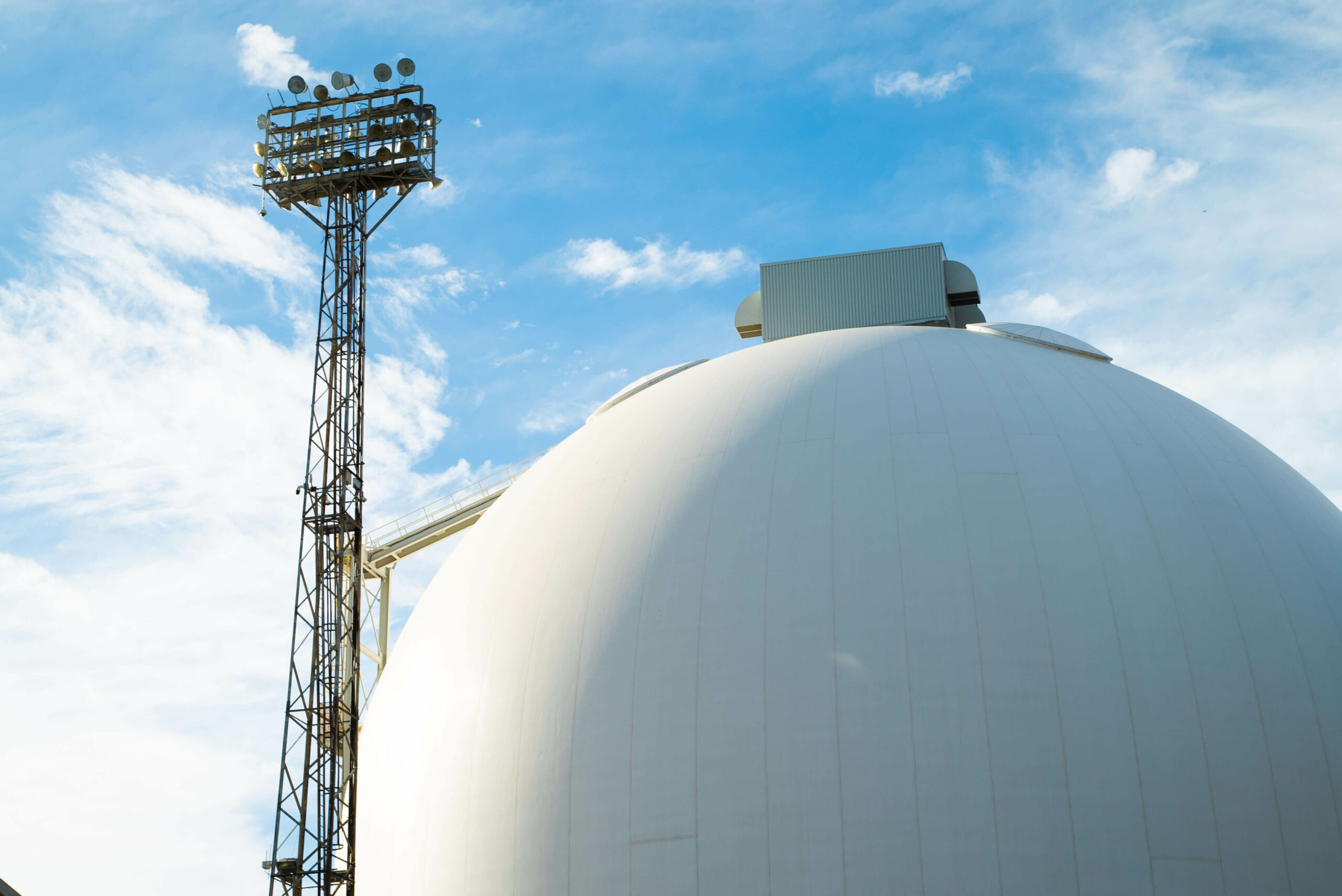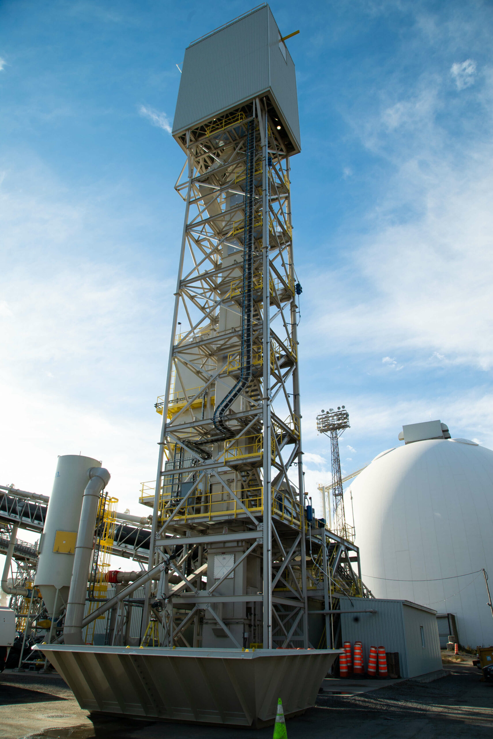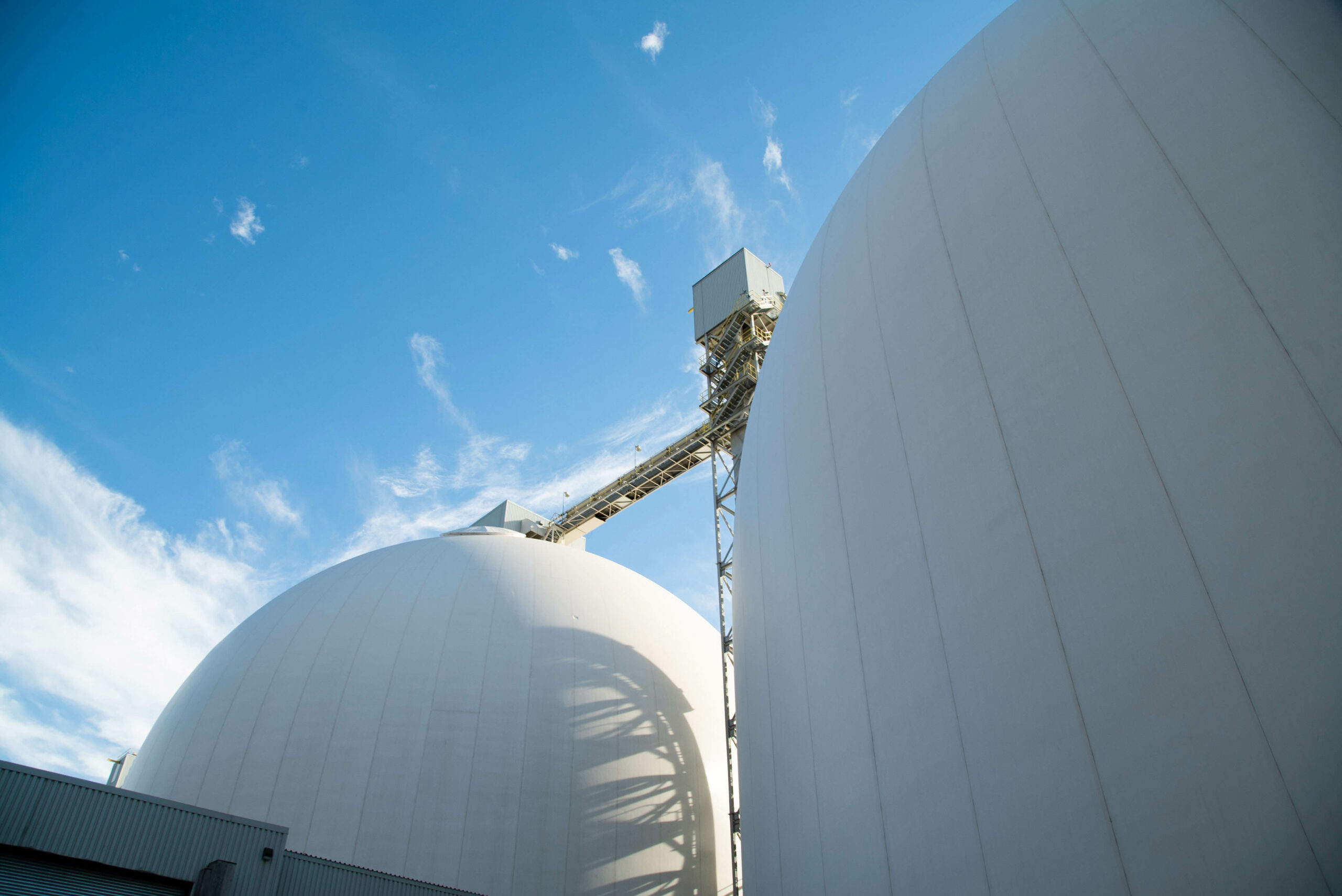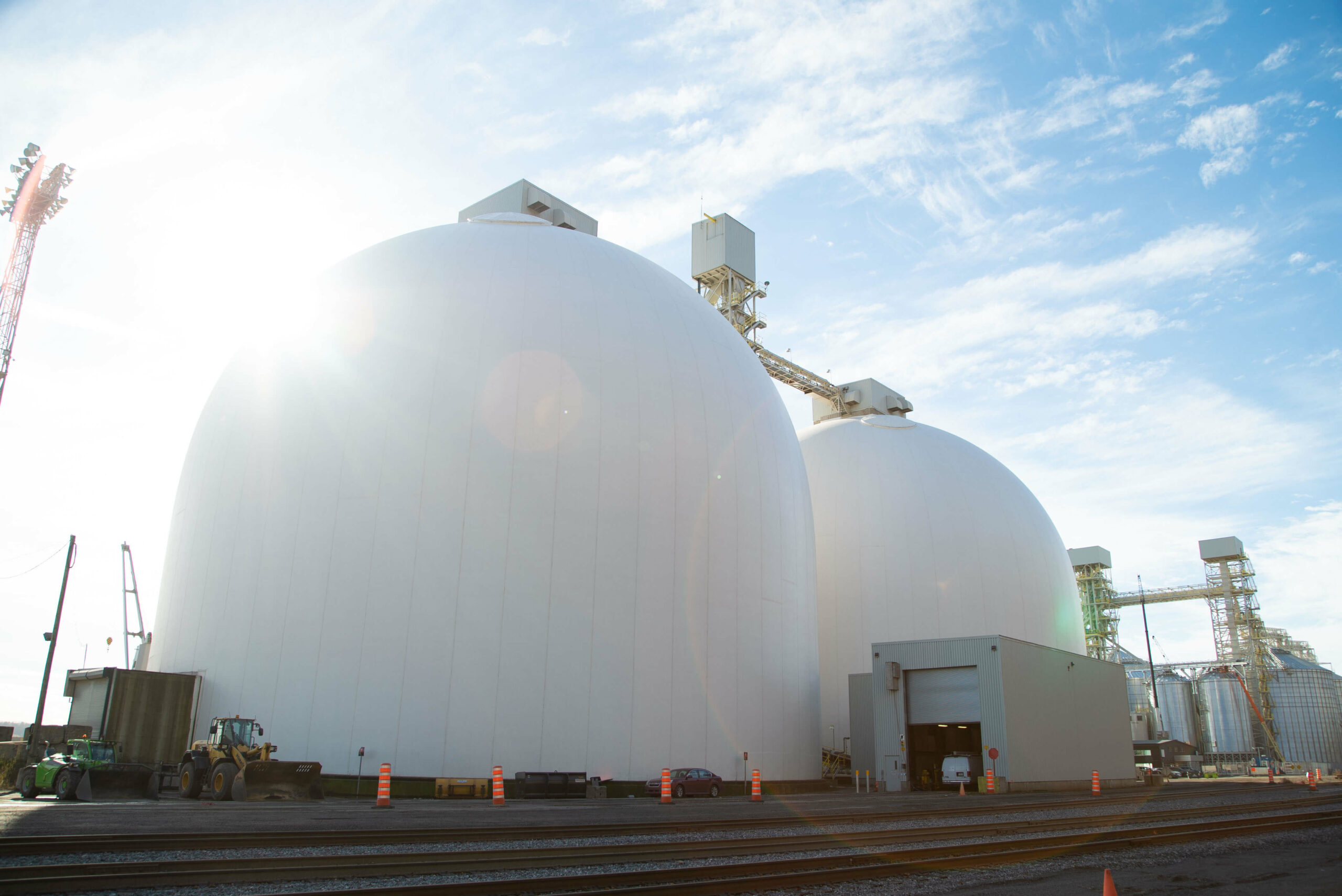 - Deux (2) silos en béton projeté de 48 mètres de diamètre, d’une capacité de 37 500 tonnes chacun ;