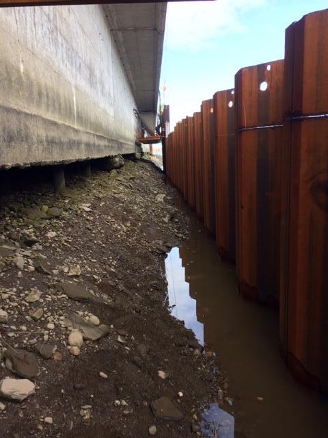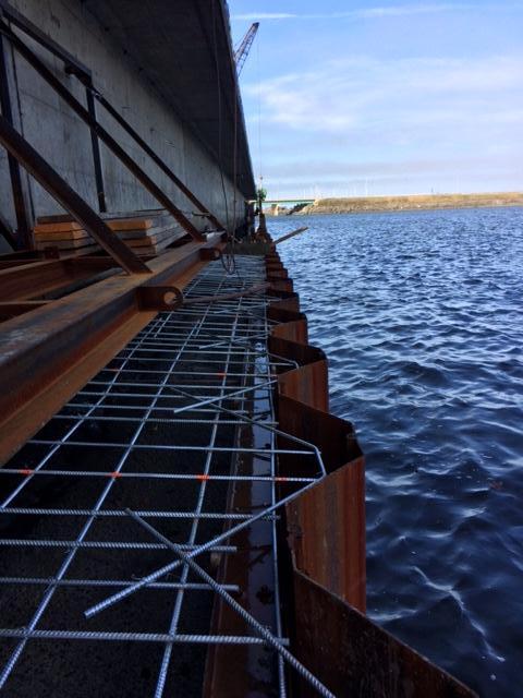 Ce projet consistait à faire la réfection d’une partie du mur de soutènement de la rue Otis sur 126 mètres linéaires en bétonnant l’affouillement sous le mur de soutènement à l’aide d’un coffrage permanent en palplanche d’acier. Le bétonnage (plus de 700 m³) était réalisé par séquence en fonction des marées.
